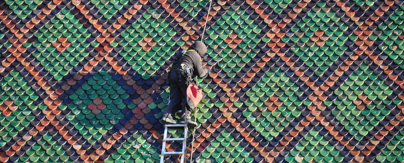 - sur les toitures, remplacement de 6000 tuiles vernissées, fabriquées artisanalement et traitement de la charpente